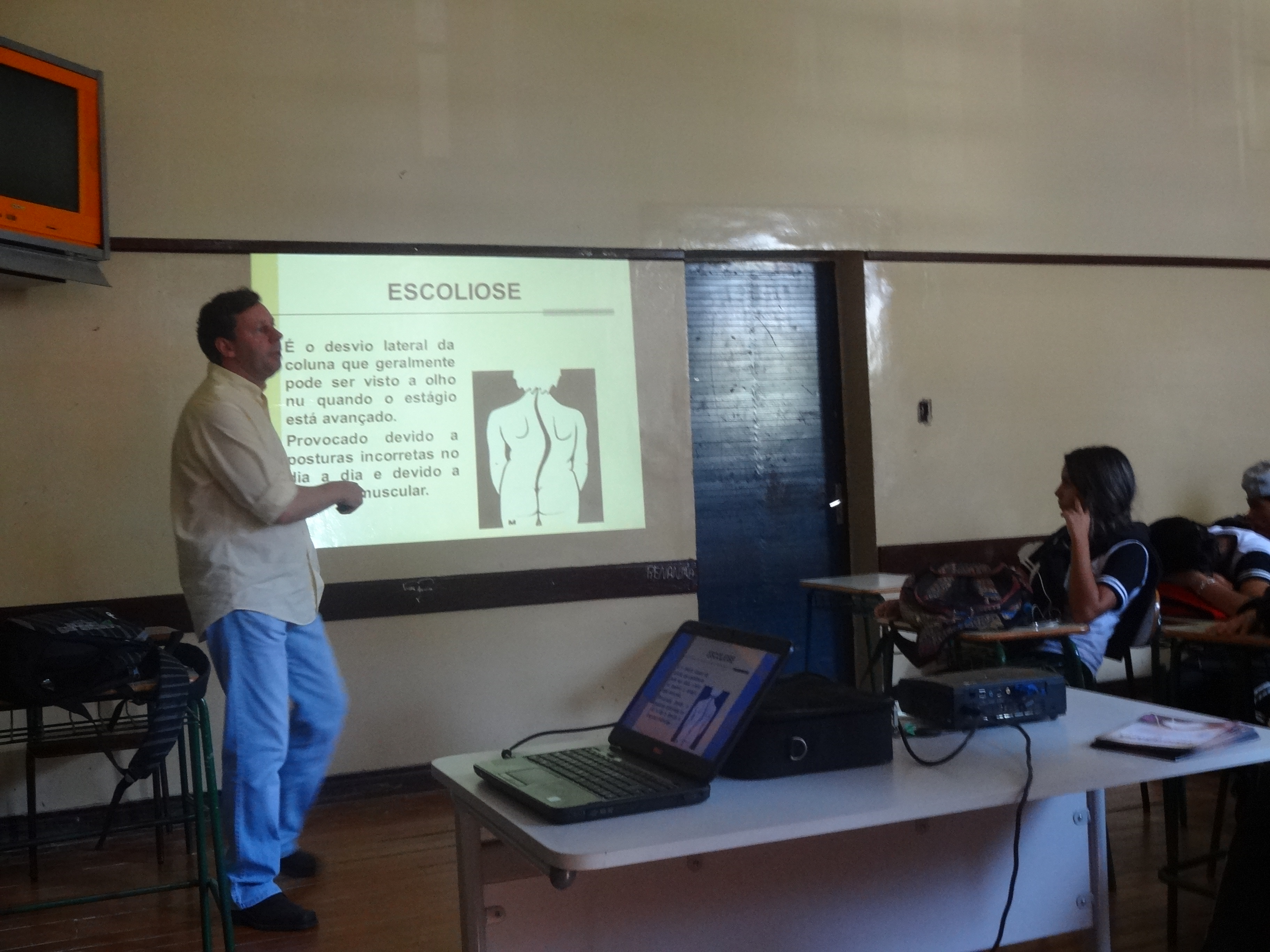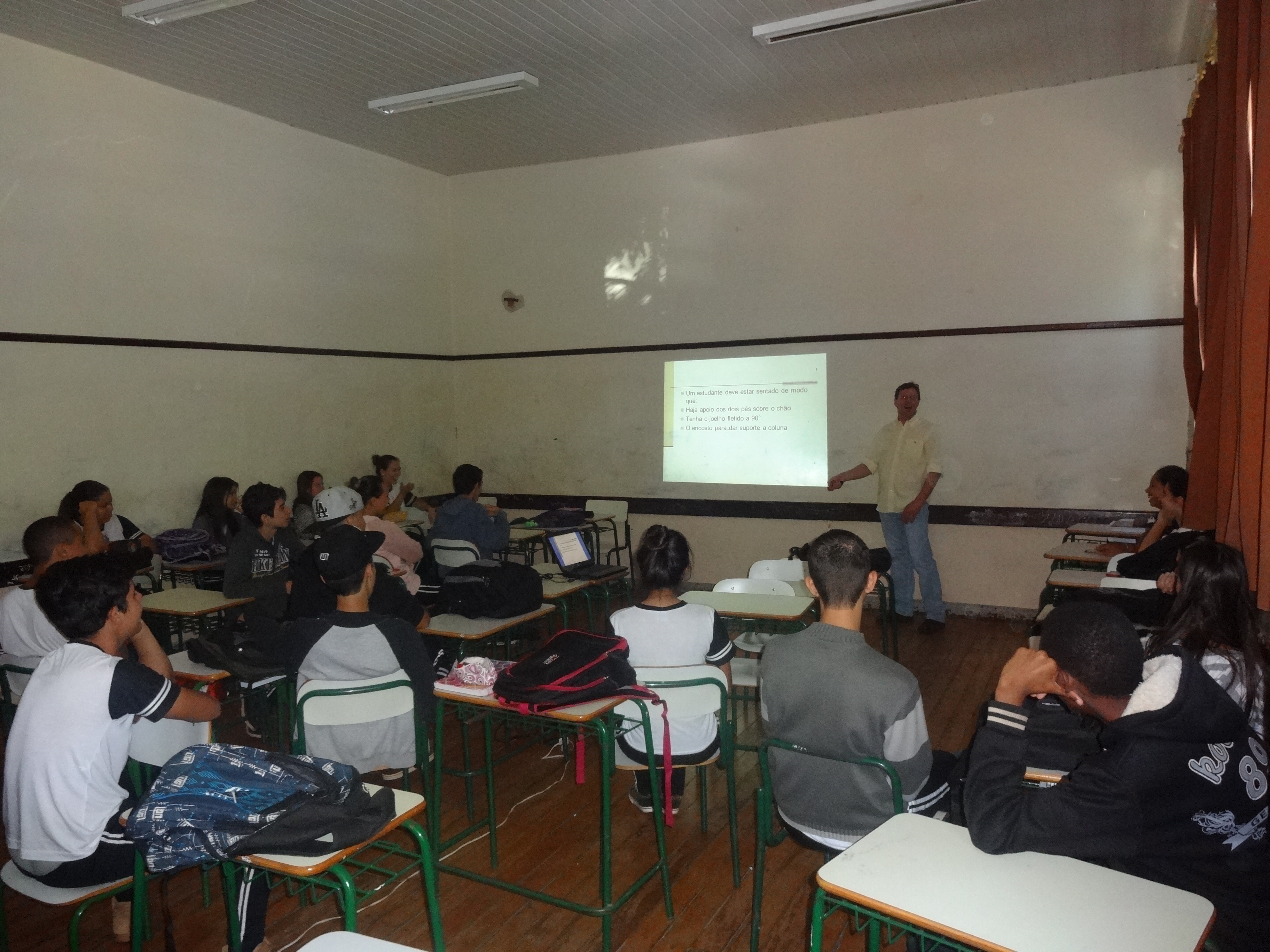 O Professor e Coordenador do curso de Fisioterapia da FAP, Kleber Rogério Andolfato, falou sobre postura e ergonomia. Demonstrou aos alunos lesões ocasionadas pela má postura em casa, no colégio e no trabalho, e cuidados que devemos ter para combater estas lesões posturais.